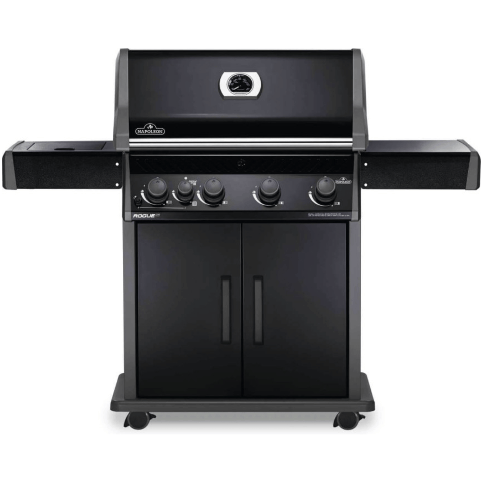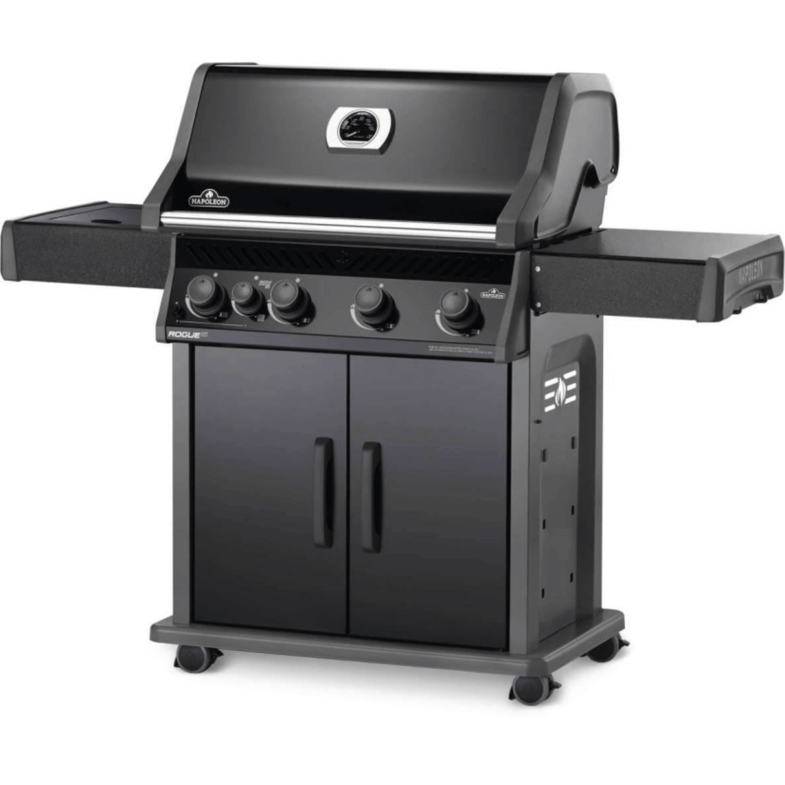 The Napoleon Rogue® 525 Natural Gas Grill with Infrared Side Burner in Black is a large and durable, easy to maintain gas grill. Featuring four main burners, stainless steel sear plates, cast grids and a high top lid, this grill has everything you need for gourmet meals. Sear restaurant-style steaks on the integrated sizzle zone side burner while generous side shelves provide plenty of prep space.