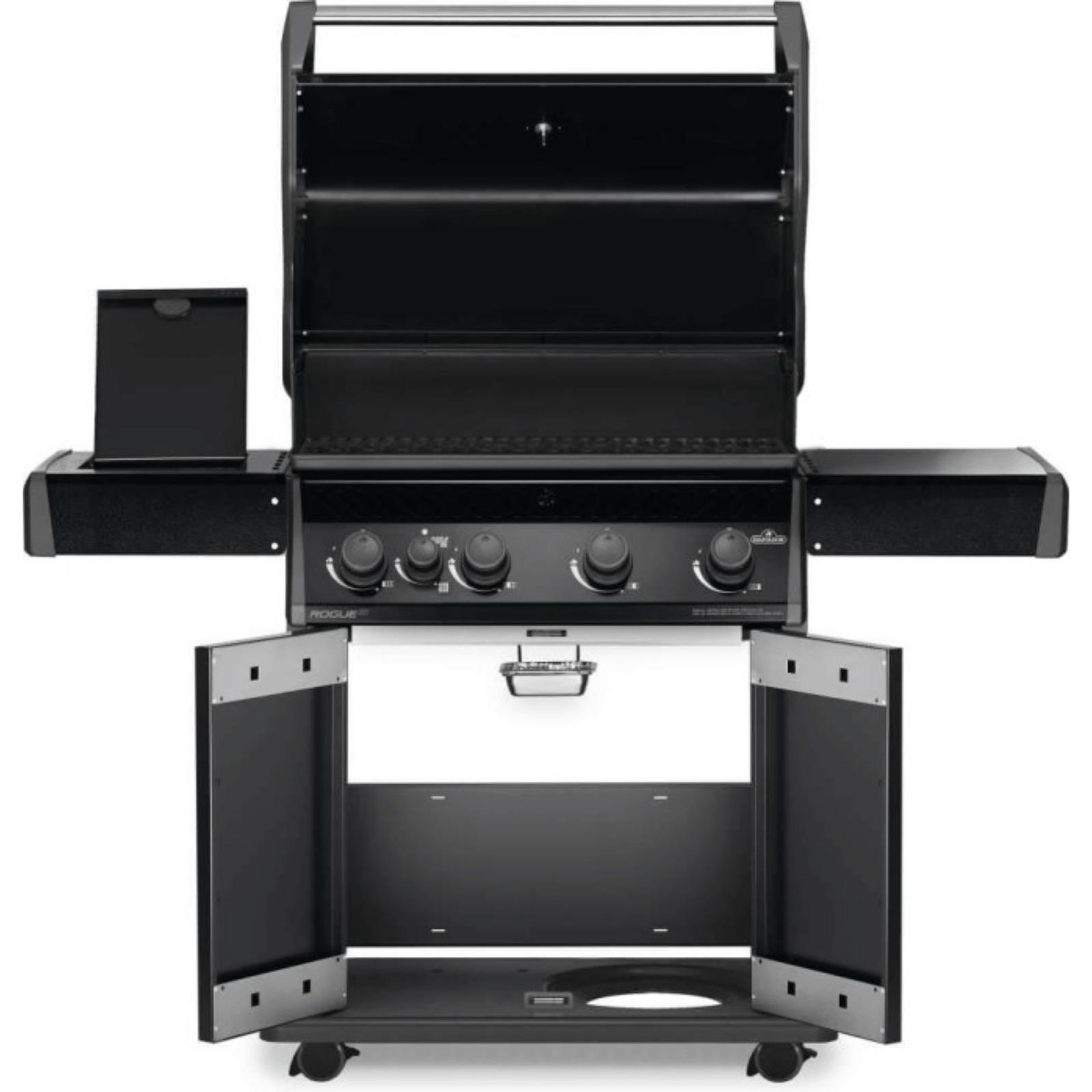 • Durable black porcelain enamel lid and doors with black powder coat control panel and side shelves stand up to any weather and don’t show fingerprints